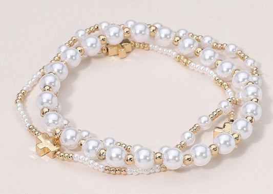 Metal Cross Pointed Pearl Beaded Stretch Multi Layered Bracelets -